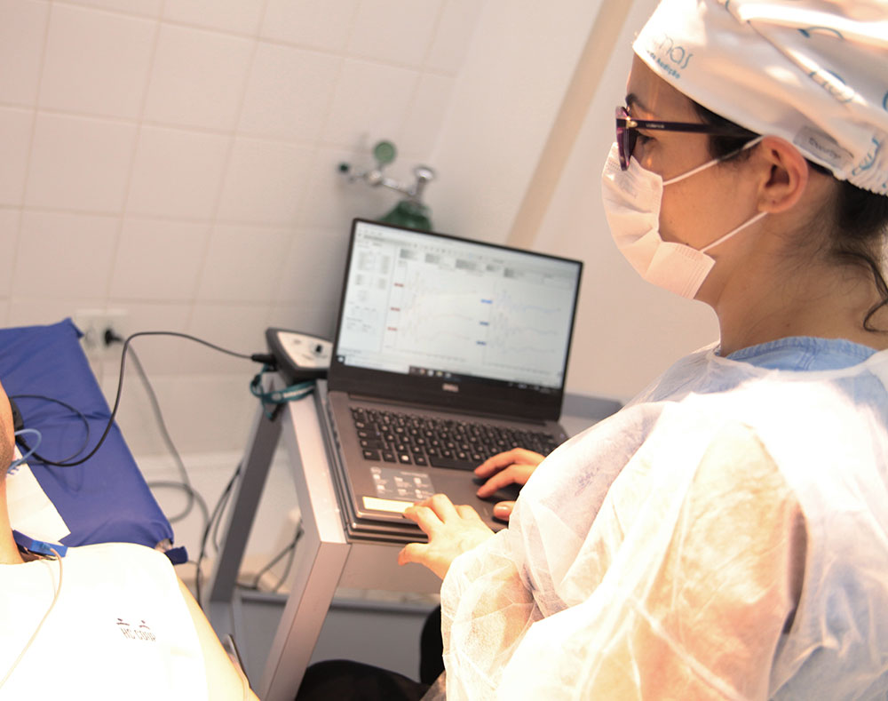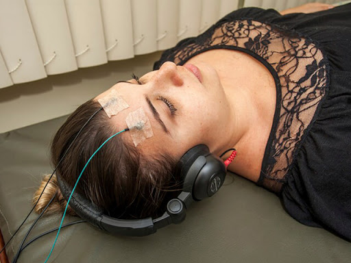 Este é um teste eletrofisiológico.O paciente deve relaxar completamente e deitar sobre os eletrodos na testa e atrás das orelhas.